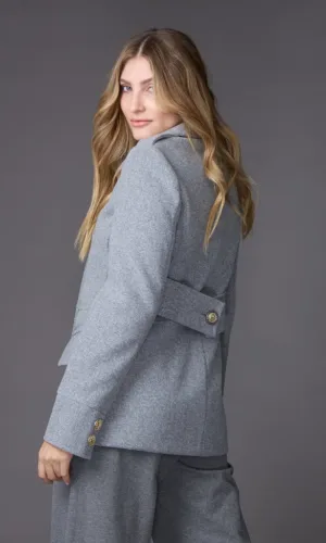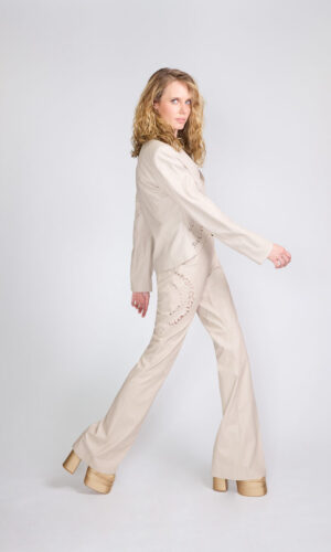 Blazer de Asimétrico corte láser: Un blazer beige en eco cuero delgado, de diseño estructurado con botones contrastantes y detalles de corte láser en las mangas, lo que le da un toque moderno y decorativo.