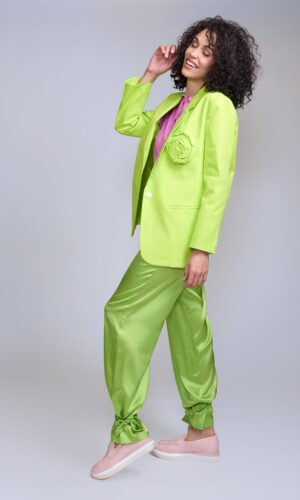 Blazer verde lima con detalle de flor, combinado con pantalón verde de seda.