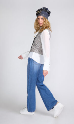 Chaleco de Mezclilla y Escocés: Sobre la camisa, un chaleco de mezclilla mitad negro y mitad escocés, que añade un toque de tendencia y contraste al conjunto.