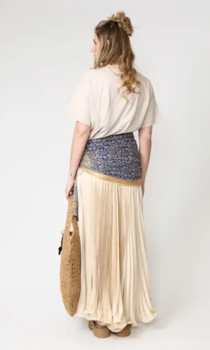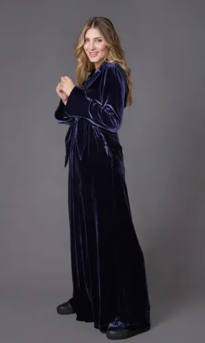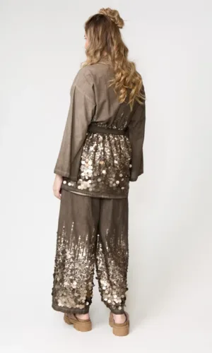 Kimono cruzado marrón con cinturón, decorado con lentejuelas doradas que caen en degradado. Acompañado de pantalón a juego. Look de impacto para fiestas, eventos nocturnos o cenas de verano.