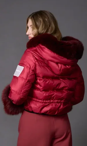 Parka puffer corta, burdeo con mangas y cuello en piel sintética
