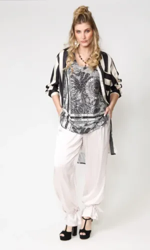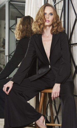 Elegante conjunto línea smoking en seda gruesa, pantalones anchos y jacket a la cadera, solapas en raso y botón joya en la delantera. Para usar solo, con un top o una camisa.