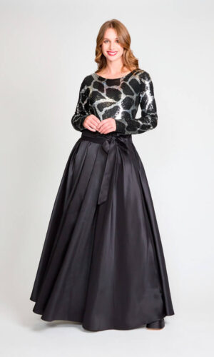 Top de lentejuelas plateadas y negras con estampado de inspiración animal, escote redondo. Faldón largo negro satinado con lazo a la cintura.