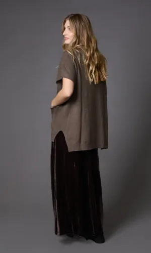 Top sin mangas estructurado en color marrón chocolate, combinado con pantalón palazzo de tiro alto.