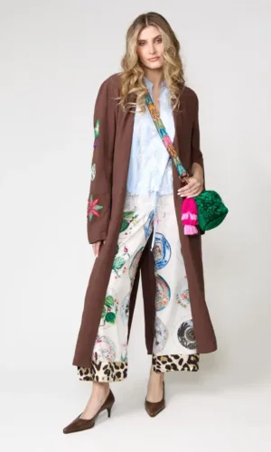 Tapado largo en color marrón con bordados florales multicolor en mangas y espalda. Se combina con pantalón blanco estampado de platos decorativos y detalles en animal print. Look boho chic sofisticado, ideal para outfits de entretiempo y estilo urbano con personalidad.