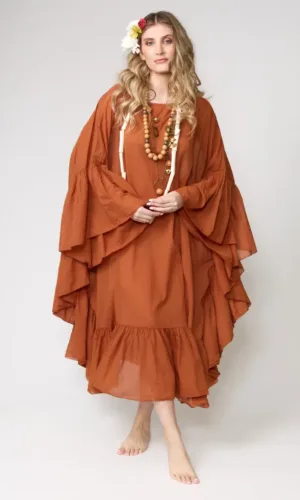 Vestido maxi fluido color terracota, con mangas murciélago y volantes en el bajo. Confeccionado en gasa ligera, ideal para un look boho chic de verano, festivales o vacaciones en la playa.