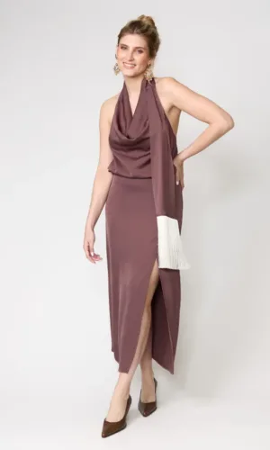 Conjunto de top halter drapeado en satén marrón y falda midi a juego con botones decorativos y abertura lateral. Detalle de flecos en la cadera que añade un toque boho elegante. Outfit ideal para noches de verano, cenas y eventos sofisticados.