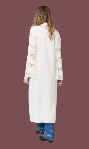 Vestido camisero minimalista en tono blanco, con botonadura frontal y mangas largas de tejido calado. Estilo versátil que puede usarse como vestido o sobrepuesto con jeans. Look casual elegante ideal para primavera-verano.