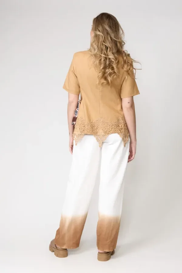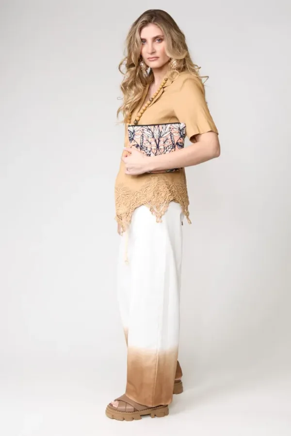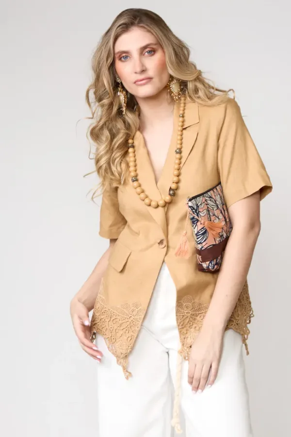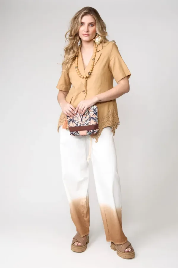 Blazer corto en lino color mostaza con detalles de encaje en el bajo, combinado con pantalón palazzo en degradé beige a marrón. Look sofisticado y boho chic, perfecto para ocasiones de día o un afterwork elegante.
