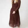 Blusa blanca fluida con bordados frontales y mangas largas con sutiles volantes en los puños.