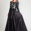 Blusa de gasa negra con vuelos y detalle floral. Falda larga, de encaje de lentejuelas con abertura central.