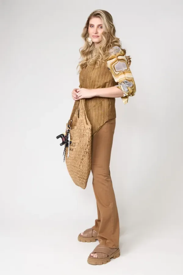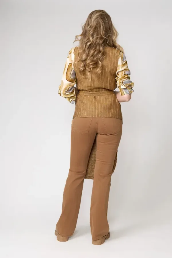 Chaleco largo de lino marrón con finas rayas verticales y cinturón ajustable, combinado con camisa estampada en tonos tierra y pantalón camel. Un look urbano con inspiración retro y aire artesanal.