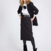 Blazer: Un blazer de dos tonos, con solapas y frente en un tejido gris texturizado y mangas en negro liso, en tela de parka, con puños y cierres verticales. ofreciendo una silueta clásica con un giro contemporáneo.