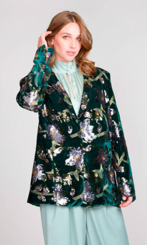 Blazer de terciopelo verde oscuro con bordado floral en lentejuelas.