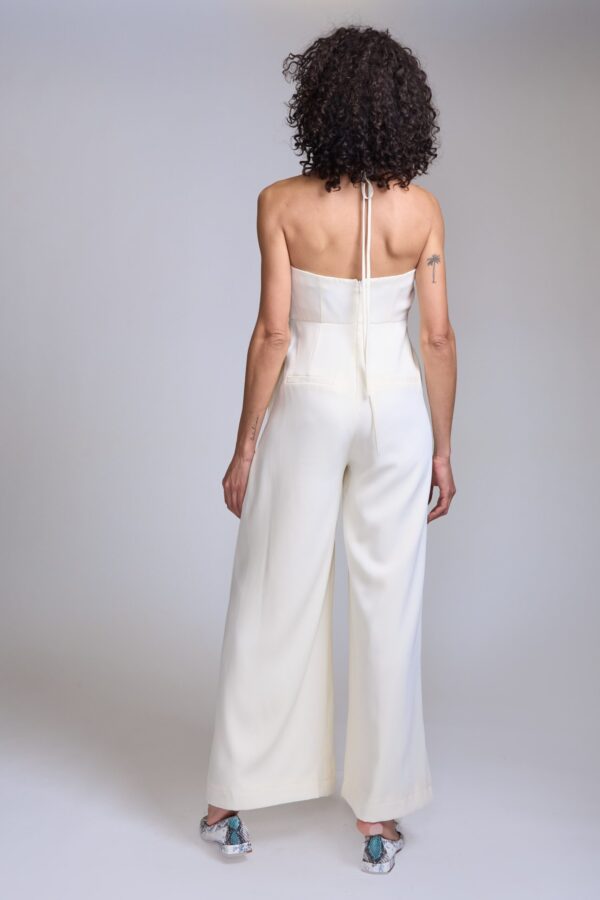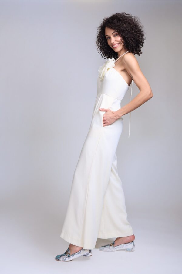 Enterito blanco de escote halter con detalle floral en el pecho.