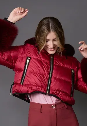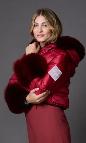 Parka puffer corta, burdeo con mangas y cuello en piel sintética
