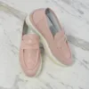 Sueco de cuero natural con taco medio cuadrado. Origen: Italia.