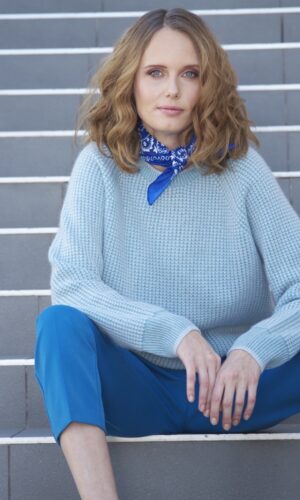 Sweater cashmere, cuello redondo hecho en USA, punto fantasía y manga larga.