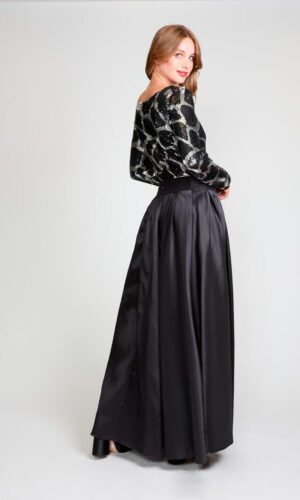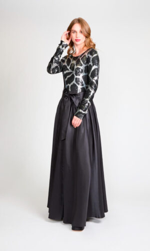 Top de lentejuelas plateadas y negras con estampado de inspiración animal, escote redondo. Faldón largo negro satinado con lazo a la cintura.