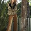 Hermoso, romántico y audaz vestido en rosa empolvado. Corte trapecio, sin mangas y en singular tela de poliéster que combina flecos de hilo de seda y lentejuelas.