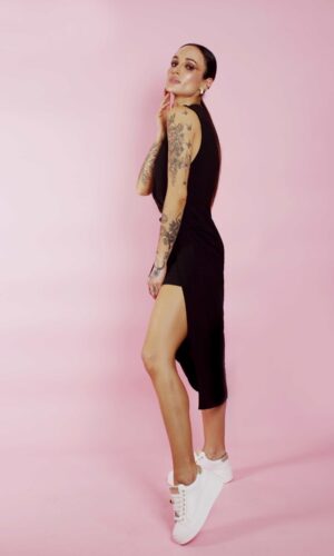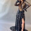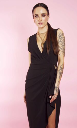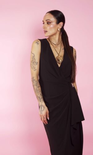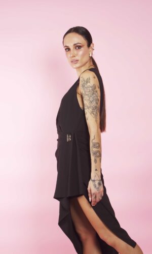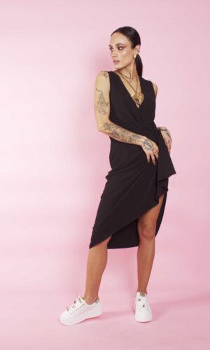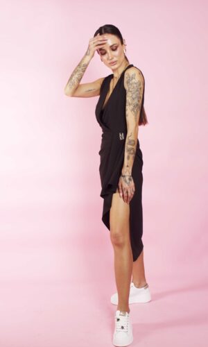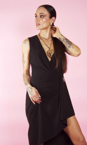 VESTIDO NEGRO ESCOTE EN V Y DRAPEADO,ABERTURA AL LADO