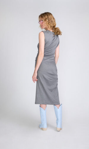 Vestido Ajustado: Un vestido ceñido de color gris, con escote bote, y drapeados alternados en la cintura y caderas.