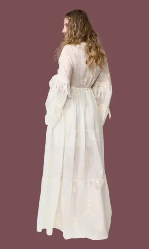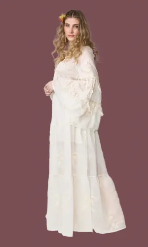 Vestido largo romántico en gasa ligera color marfil, con detalles bordados en flores y aplicaciones de encaje. Sus mangas amplias y vuelo fluido lo convierten en un vestido bohemio perfecto para eventos de día, bodas en la playa o looks de vacaciones.