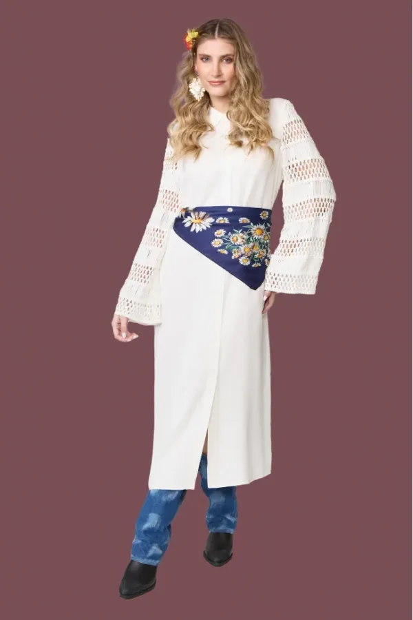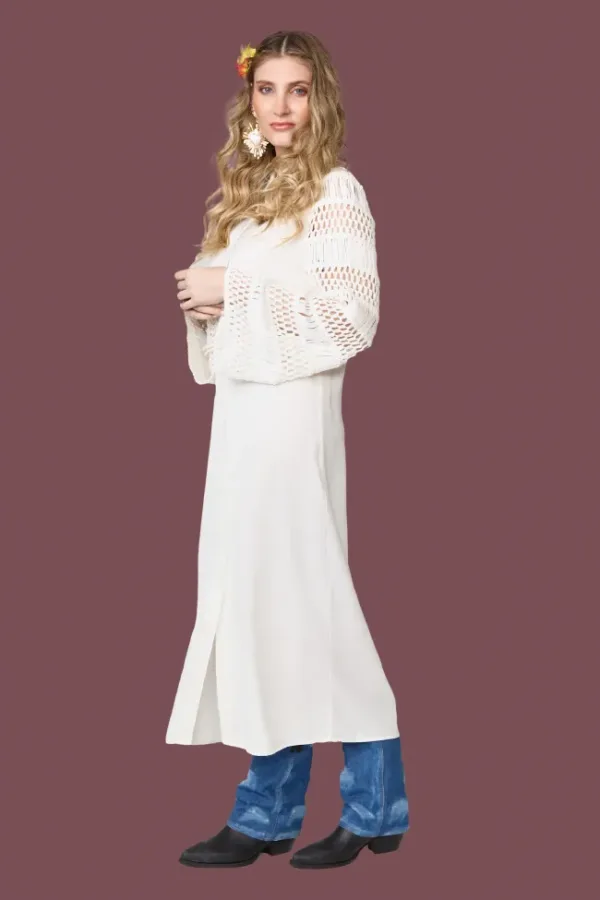 Vestido camisero minimalista en tono blanco, con botonadura frontal y mangas largas de tejido calado. Estilo versátil que puede usarse como vestido o sobrepuesto con jeans. Look casual elegante ideal para primavera-verano.