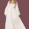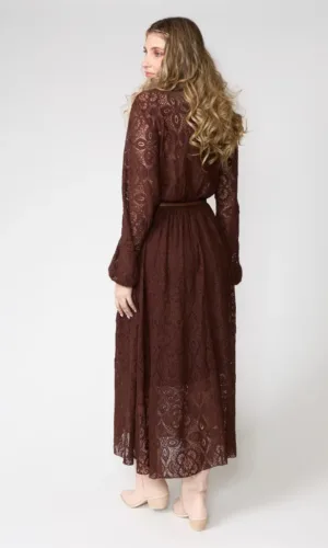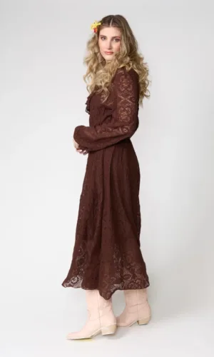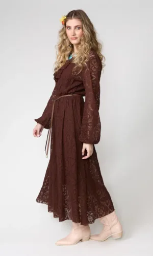 Vestido boho chic confeccionado en encaje floral color marrón chocolate. De manga larga y escote en “V” con delicados volantes. Ideal como vestido de verano, outfit de playa o look casual elegante.