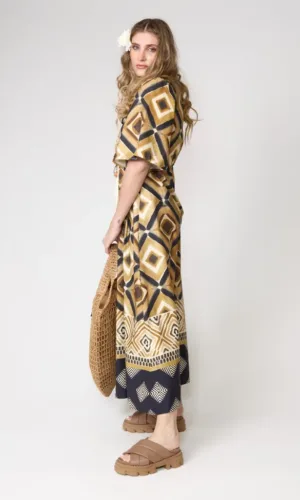 Vestido de corte evasé en satén estampado geométrico con tonos mostaza, beige y negro. Manga corta y escote con detalle de lazo. Perfecto para un look boho elegante.