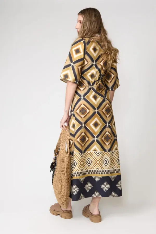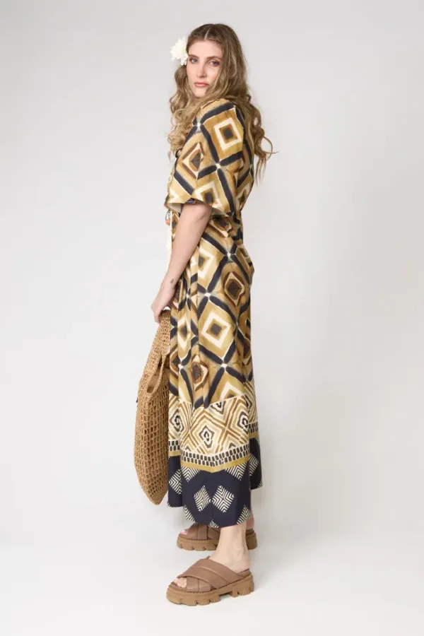 Vestido de corte evasé en satén estampado geométrico con tonos mostaza, beige y negro. Manga corta y escote con detalle de lazo. Perfecto para un look boho elegante.