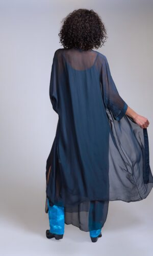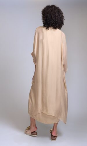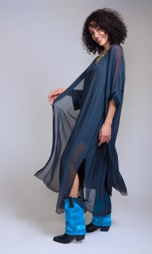 Kaftán largo en tono azul oscuro o beige, con caída fluida y abertura lateral. Elegante y versátil, perfecto para un look sofisticado con un toque bohemio.